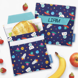No more plastic wrap, zip lock bags, aluminum foil or tupperware that take up more room than snack. You can reduce waste and save money with Stikets personalised snack bags. They are the best ecological, practical and fun solution for carrying snacks to nursery school, to field trips, on car trips or to work. Reduce waste and save with custom Stikets snack bags.